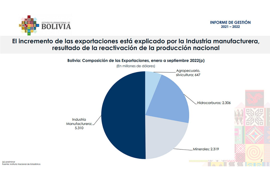 “La industria manufacturera se constituye en el principal sector de exportación, superando a hidrocarburos y minería, con $us 5.831,6 millones, que representa el 50% del total de las exportaciones. Según el Instituto Nacional de Estadística (INE), las exportaciones a octubre de 2022 registraron $us 11.632 millones y las importaciones $us 10.807 millones, con un saldo comercial de $us 825 millones”, detalló.