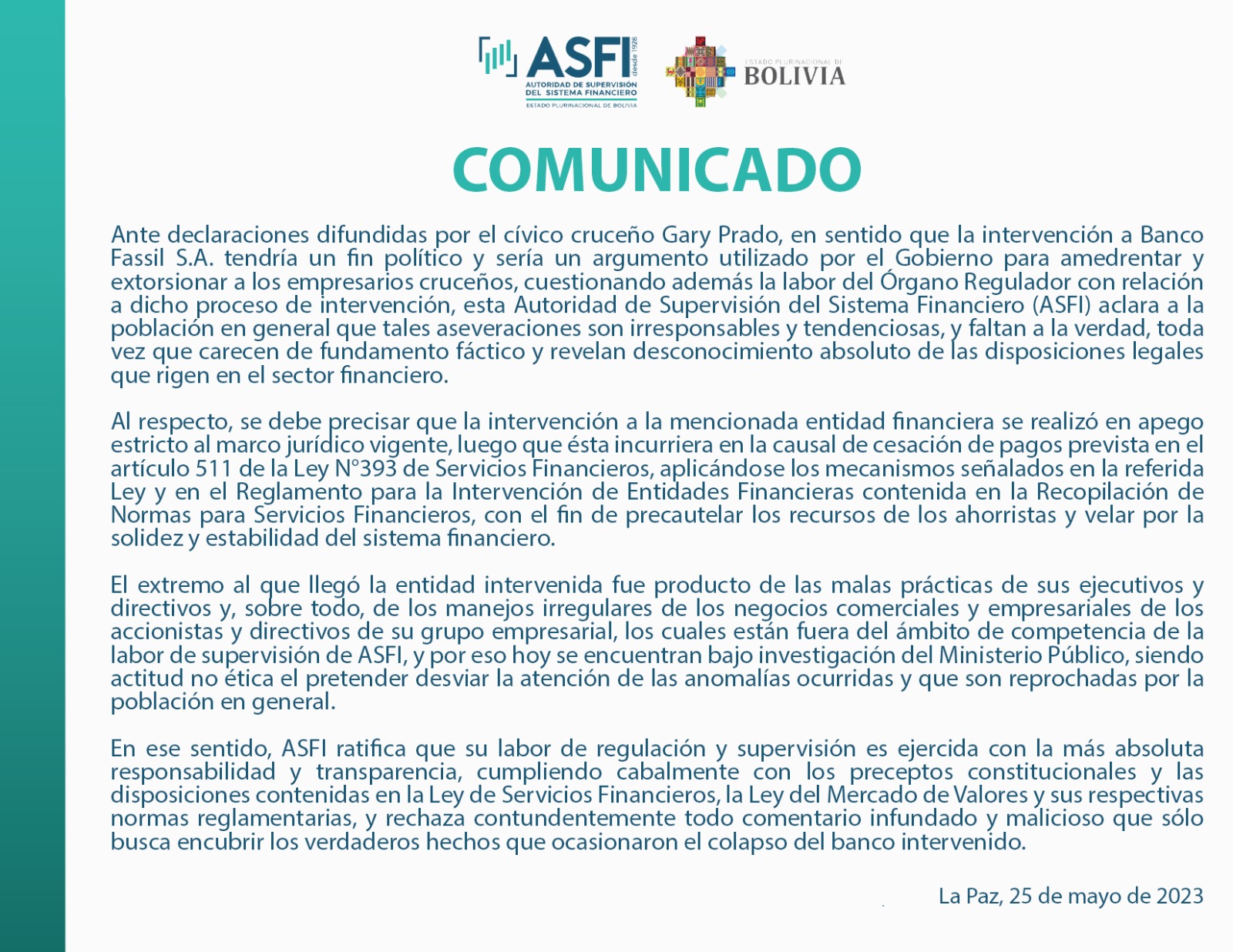 La Paz, 25 de mayo de 2023.- Ante declaraciones difundidas por el cívico cruceño Gary Prado, en sentido que la intervención a Banco Fassil S.A. tendría un fin político y sería un argumento utilizado por el Gobierno para amedrentar y extorsionar a los empresarios cruceños, cuestionando además la labor del Órgano Regulador con relación a dicho proceso de Intervención, esta Autoridad de Supervisión del Sistema Financiero (ASFI) aclara a La población en general que tales aseveraciones son irresponsables y tendenciosas, Y faltan a la verdad, toda vez que carecen de fundamento fáctico y revelan desconocimiento absoluto de las disposiciones legales que rigen en el sector financiero.
