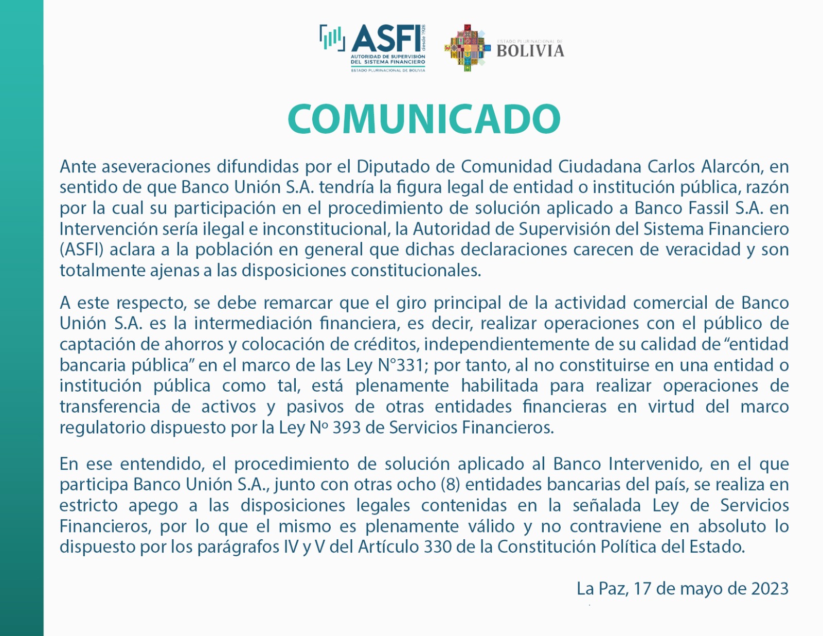 La Paz, 17 de mayo de 2023.- Ante aseveraciones difundidas por el Diputado de Comunidad Ciudadana Carlos Alarcón, en sentido de que Banco Unión S.A. tendría la figura legal de entidad o institución pública, razón por la cual su participación en el procedimiento de solución aplicado a Banco Fassil S.A. en Intervención sería ilegal e inconstitucional, la Autoridad de Supervisión del Sistema Financiero (ASFI) aclara a la población en general que dichas declaraciones carecen de veracidad y son totalmente ajenas a las disposiciones constitucionales.
