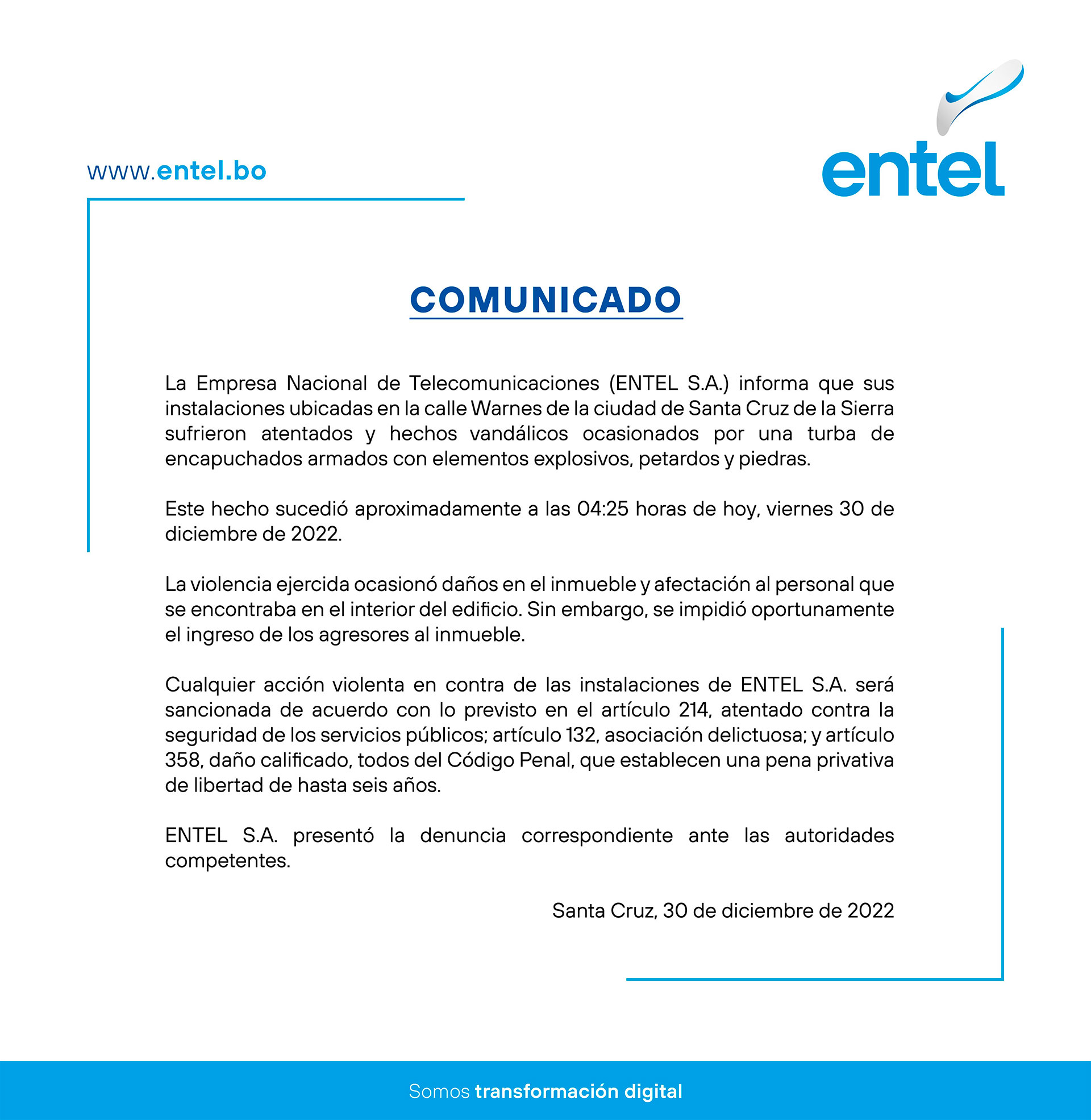 “Entel S.A. informa que sus instalaciones ubicadas en la calle Warnes de la ciudad de Santa Cruz de la Sierra sufrieron atentados y hechos vandálicos ocasionados por una turba de encapuchados armados con elementos explosivos, petardos y piedras”, informó la empresa mediante un comunicado.