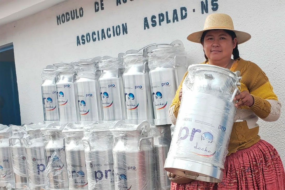 Para ese objetivo, el ministro de Desarrollo Productivo y Economía Plural, Néstor Huanca, y el director de la entidad Pro-Bolivia, Vidal Coria, entregaron equipamiento a los productores lecheros de esa provincia paceña.