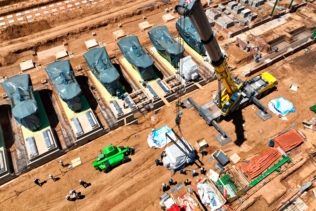Los equipos, maquinarias y demás materiales de construcción llegan del exterior a los puertos de Arica, Iquique y a atracaderos del Río Paraná – Paraguay para ser trasladados en camiones hasta predios de la planta siderúrgica, en la localidad cruceña de Puerto Suárez.