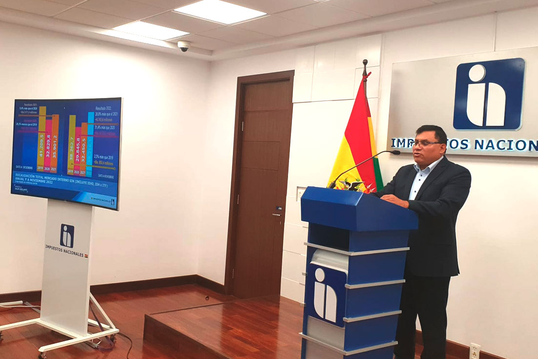 La recaudación del Mercado Interno (MI) creció en 21,6% al incrementarse de Bs 24.825 millones entre enero y noviembre de 2021 a Bs 30.180 millones en el mismo periodo del presente año, informó este martes el presidente del Servicio de Impuestos Nacionales (SIN), Mario Cazón.