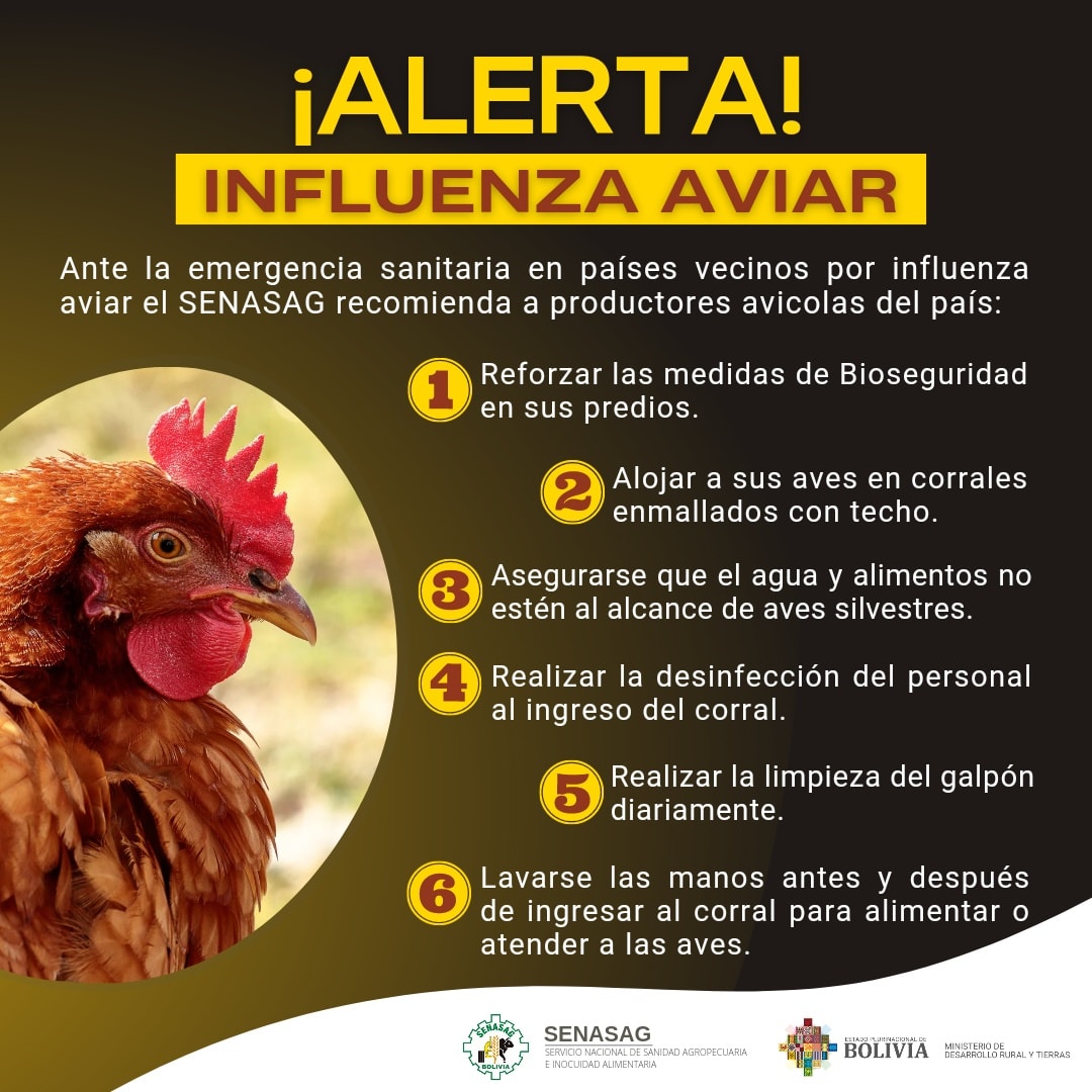 El Servicio Nacional de Sanidad Agropecuaria e Inocuidad Alimentaria (Senasag) declaró alerta sanitaria en el territorio nacional, ante la presencia de la influenza aviar en países vecinos, informó este viernes el director de la entidad, Javier Suárez.