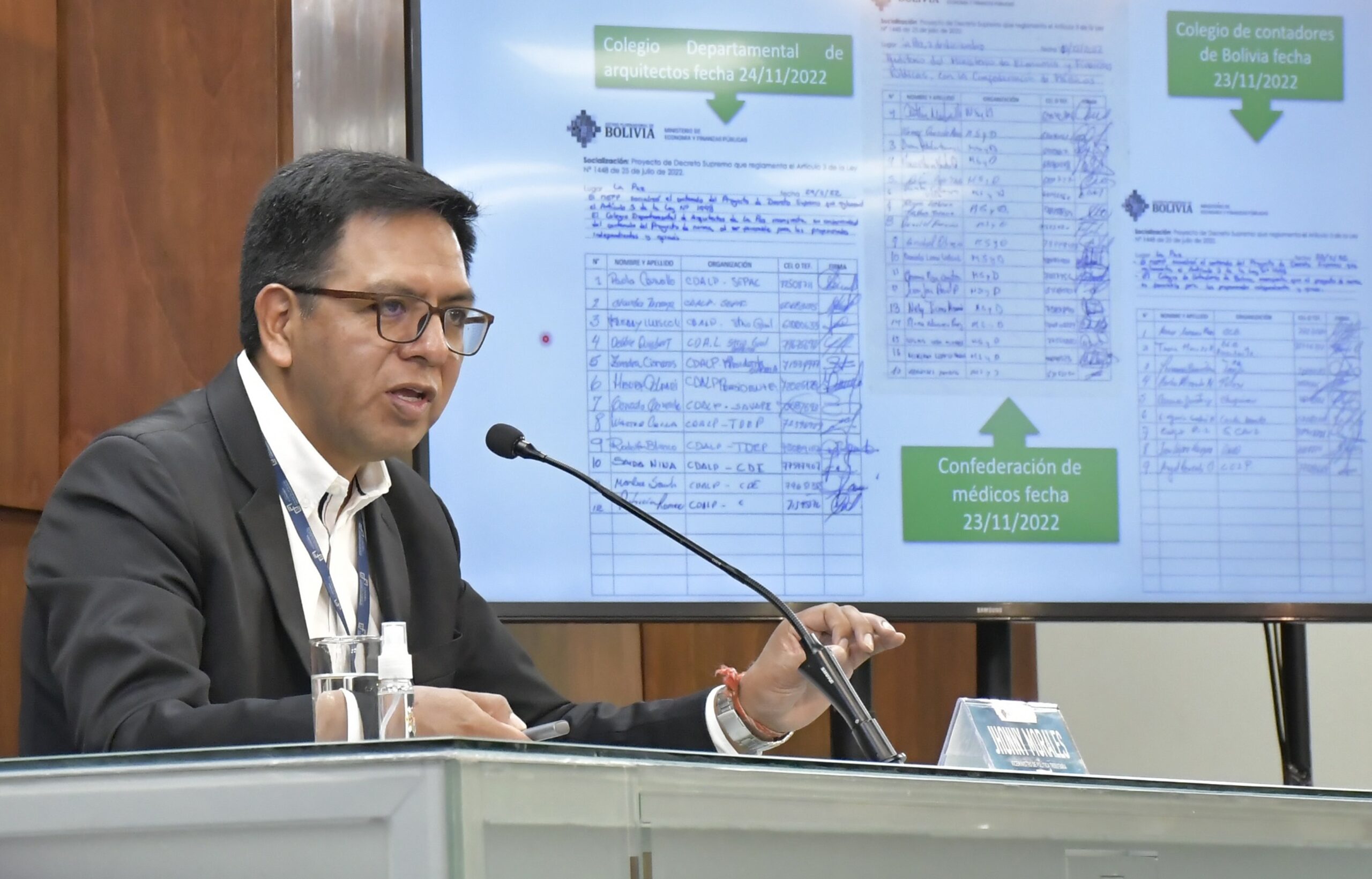 En conferencia de prensa, explicó que el DS 4850 reglamenta la Ley 1448 y tiene por objeto migrar la tributación por concepto de IUE de los profesionales independientes (abogados, médicos, contadores y otros) para que tributen a partir del 1 de enero de 2023 en el RC -IVA.