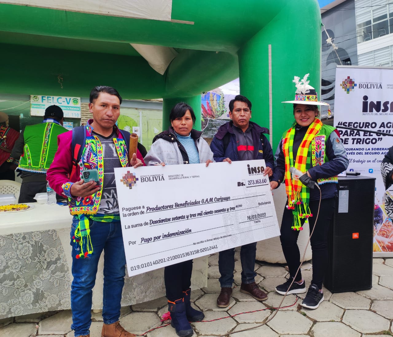 El Instituto del Seguro Agrario (INSA) entregó cheques simbólicos por indemnización a los municipios de Llallagua, Sacaca, Caripuyo, del departamento de Potosí, por la pérdida de cultivos agrícolas en la campaña de verano 2020 – 2021.