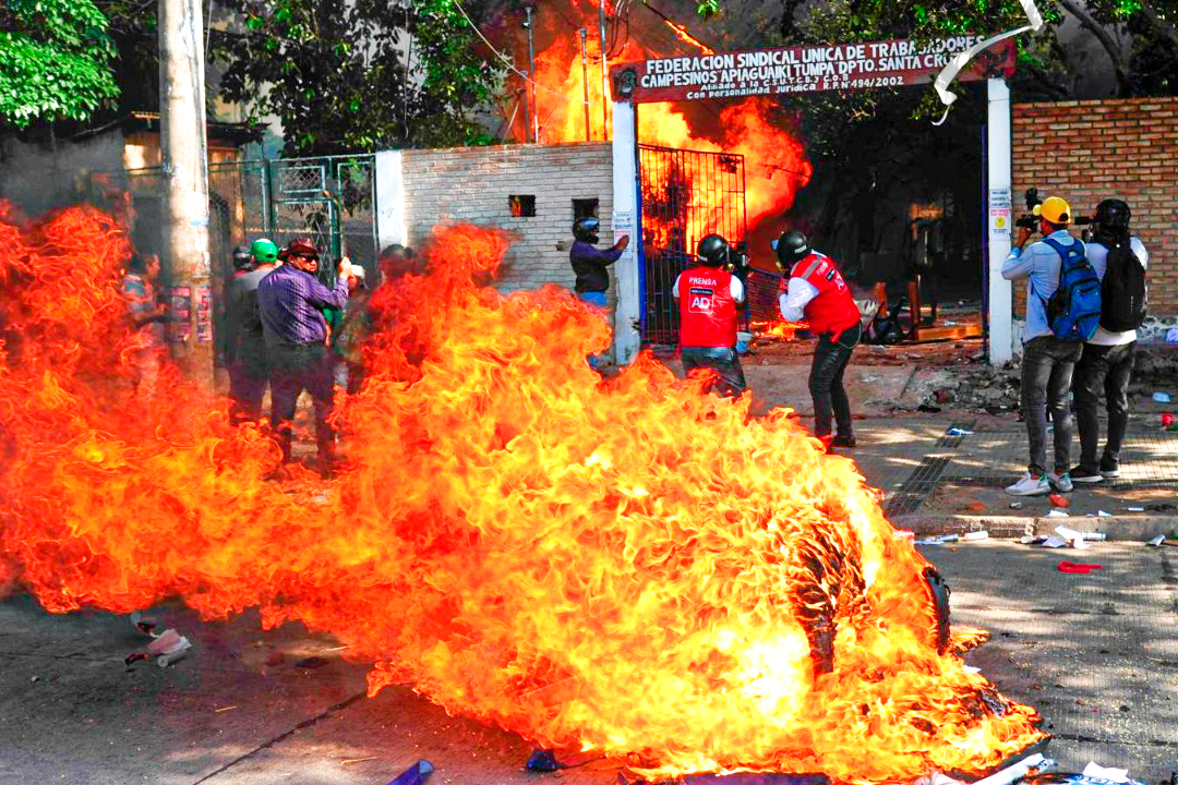 En la víspera, el brazo operativo del Comité Cívico, la Unión Juvenil Cruceñista (UJC), actuó con extrema violencia tras el paso de una marcha pacífica de sectores sociales que pedían el cese del bloqueo cívico, generando enfrentamientos, heridos y la toma de instituciones.