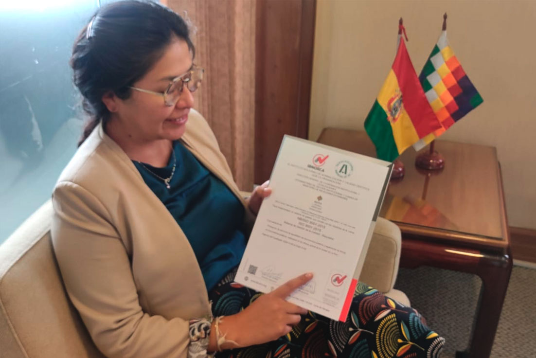 Para la viceministra Chuquimia es un orgullo que las instituciones del Estado boliviano, como la Dirección de Legalizaciones de Cancillería, logren obtener dicha certificación internacional que respalda sus servicios.