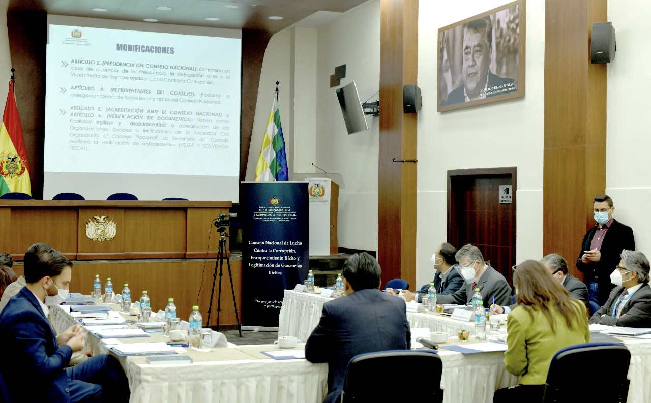 “En cumplimiento de la Ley 974 de Unidades de Transparencia y Lucha Contra la Corrupción, el Consejo Nacional de Lucha Contra la Corrupción, Enriquecimiento Ilícito y Legitimación de Ganancias Ilícitas desarrolló la reunión de la presente gestión, en la que además se plantearon las acciones que se desarrollarán para la lucha contra la corrupción durante la próxima gestión”, indica una nota institucional.