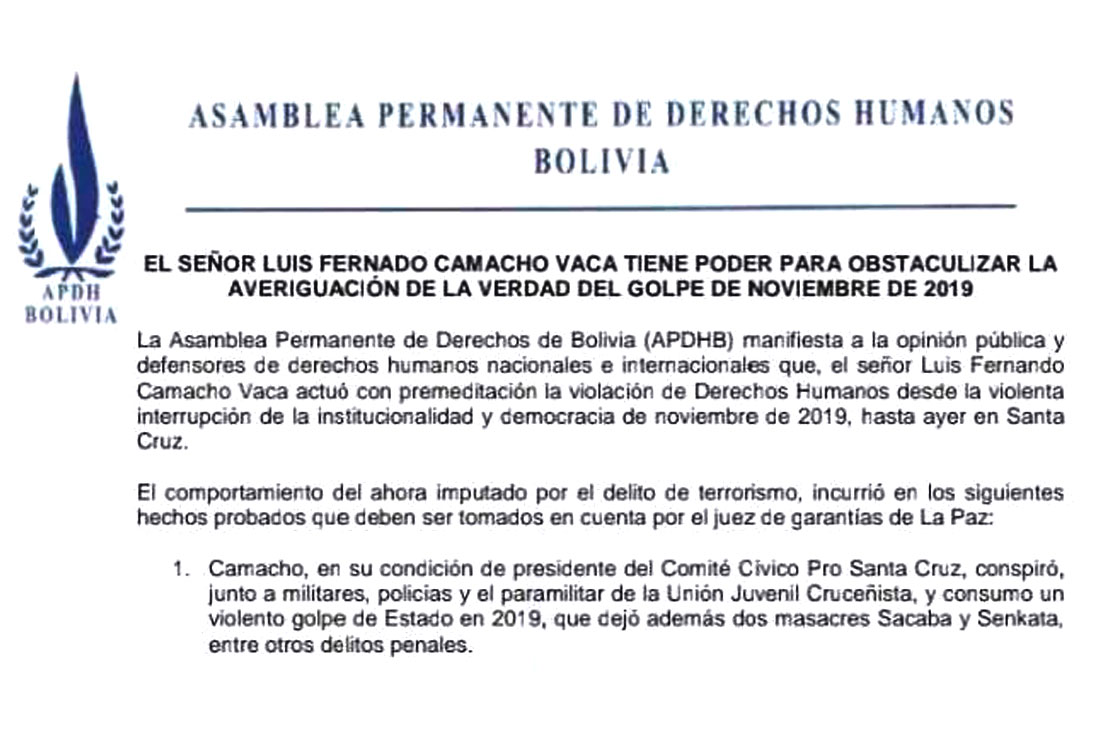 Ante ello, la APDHB sugirió al juez cautelar tomar en cuenta los delitos en los que incurrió Camacho que, en su condición de presidente del Comité Cívico Pro Santa Cruz, conspiró, junto a militares, policías y a la paramilitar Unión Juvenil Cruceñista para consumar el Golpe de Estado en 2019, y las masacres de Sacaba y Senkata.
