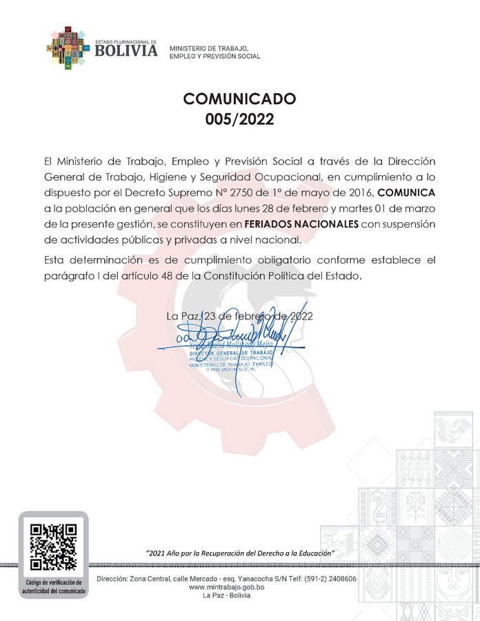 La disposición emitida a través de la Dirección General de Trabajo, Higiene y Seguridad Ocupacional, indica que “en cumplimiento a lo dispuesto por el Decreto Supremo N° 2750 del 1 de mayo de 2016, comunica a la población en general que los días 28 de febrero y martes 01 de marzo de la presente gestión, se constituyen en feriados nacionales con suspensión de actividades públicas y privadas a nivel el nacional”.