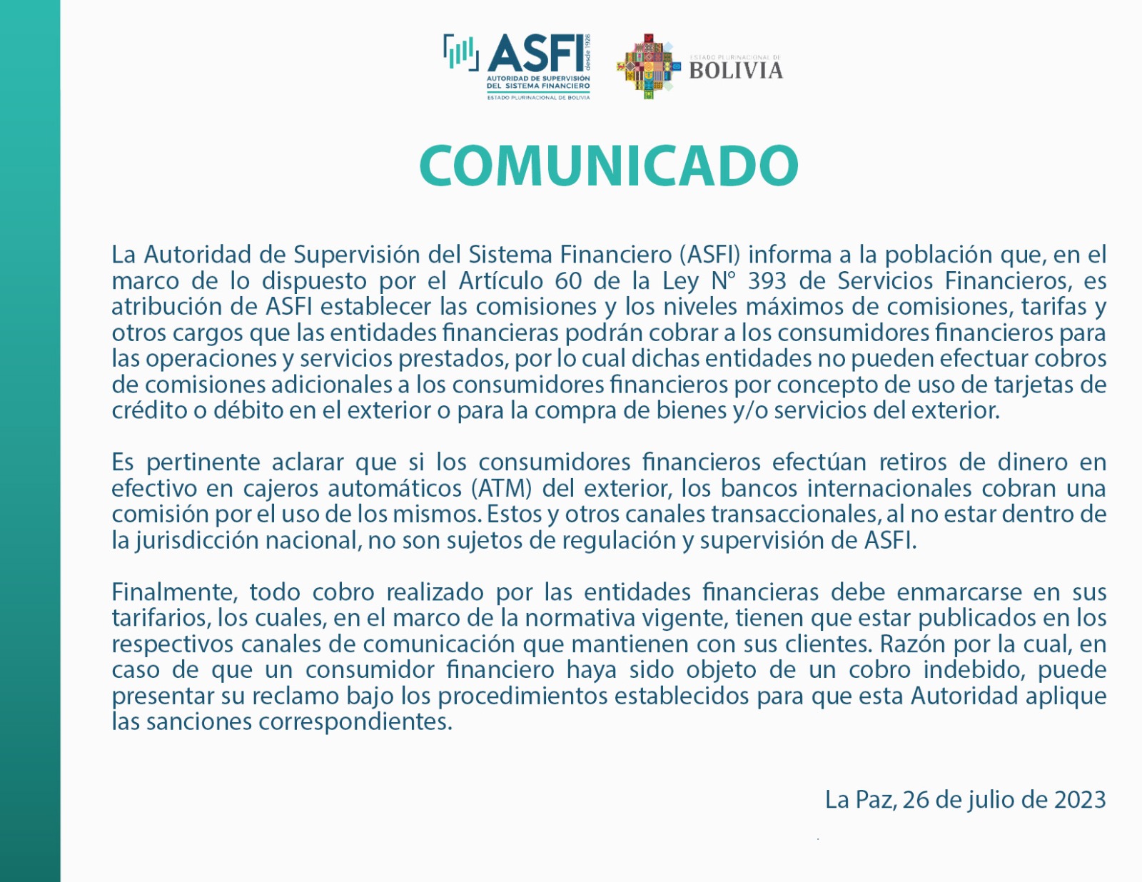 La Autoridad de Supervisión del Sistema Financiero (ASFI) informa a la población que, en el marco de lo dispuesto por el Artículo 60 de la Ley NO 393 de Servicios Financieros, es atribución de ASFI establecer las comisiones y los niveles máximos de comisiones, tarifas y otros cargos que las entidades financieras podrán cobrar a los consumidores financieros para las operaciones y servicios prestados, por lo cual dichas entidades no pueden efectuar cobros de comisiones adicionales a los consumidores financieros por concepto de uso de tarjetas de crédito o débito en el exterior o para la compra de bienes y/o servicios del exterior.
