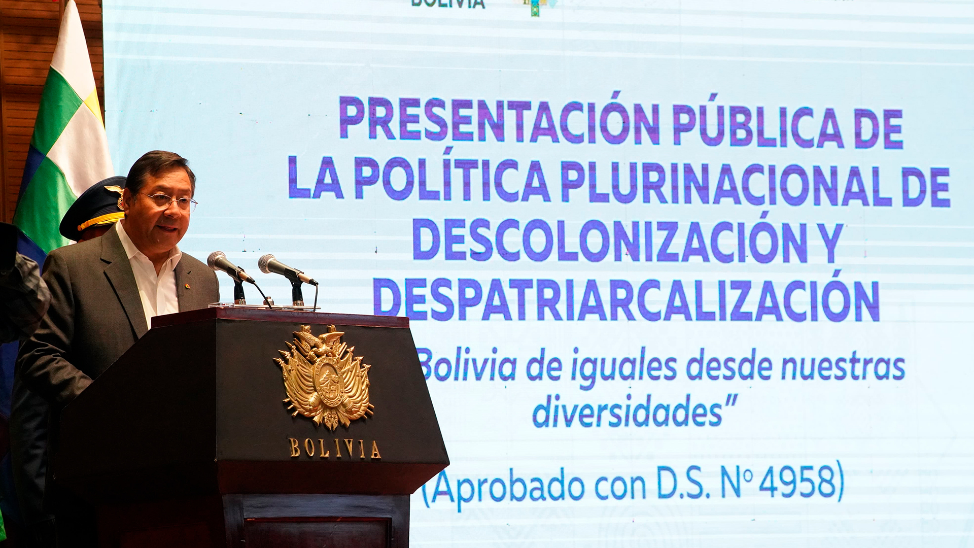 La Paz, 12 de octubre de 2023. – En el Día de la Descolonización, que se conmemora este jueves 12 de octubre, el presidente Luis Arce presentó la Política Plurinacional de Descolonización y Despatriarcalización (PPDD) «La Bolivia de Iguales desde Nuestras Diversidades», que apunta a profundizar los procesos de descolonización y despatriarcalización en la gestión pública y en la sociedad para consolidar el Estado Plurinacional y el Vivir Bien.