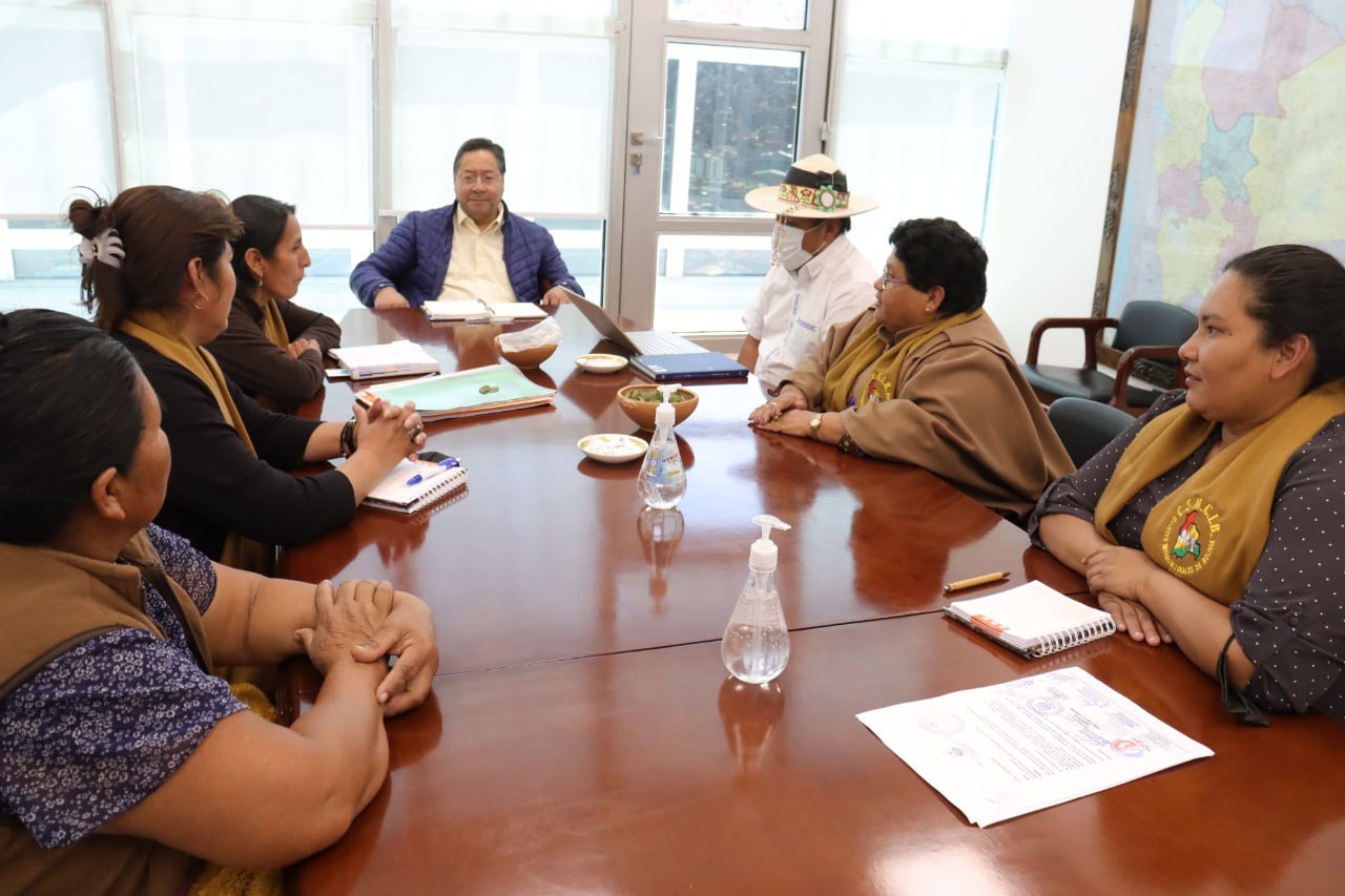 El presidente del Estado, Luis Arce Catacora, sostuvo este sábado dos reuniones con representantes de las mujeres interculturales y trabajadores campesinos, con el fin de coordinar temas productivos que hacen al desarrollo de las regiones del país.