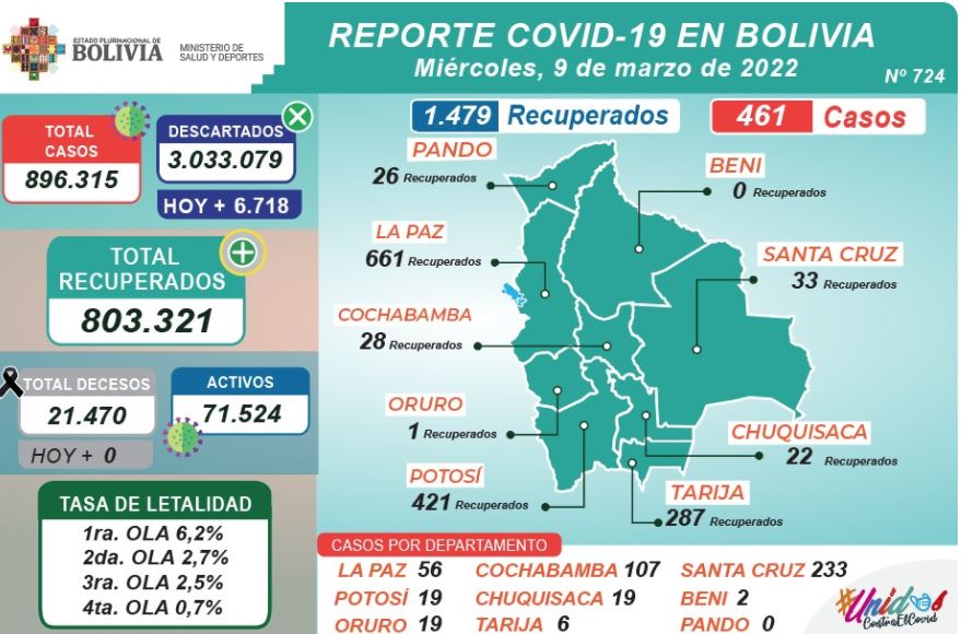 El registro de pacientes recuperados por departamento es el siguiente: 33 en Santa Cruz; 28 en Cochabamba; 661 en La Paz; 22 en Chuquisaca; 287 en Tarija; 421 en Potosí; 1 en Oruro; 0 en Beni y 26 en Pando.