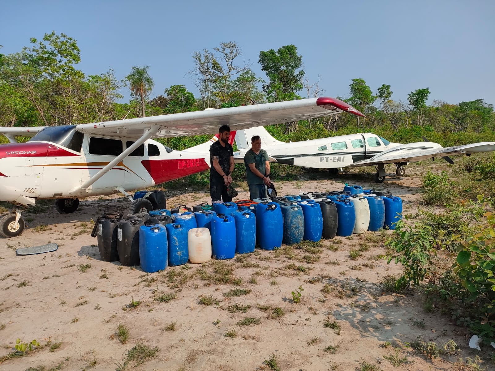 Durante el rastrillaje por la pista clandestina, se logró secuestrar combustible de aviación, embudos metálicos, mangueras y un cooler, además de adhesivos con números de matrículas CP-2627, CP-2672 y PT-LNS.