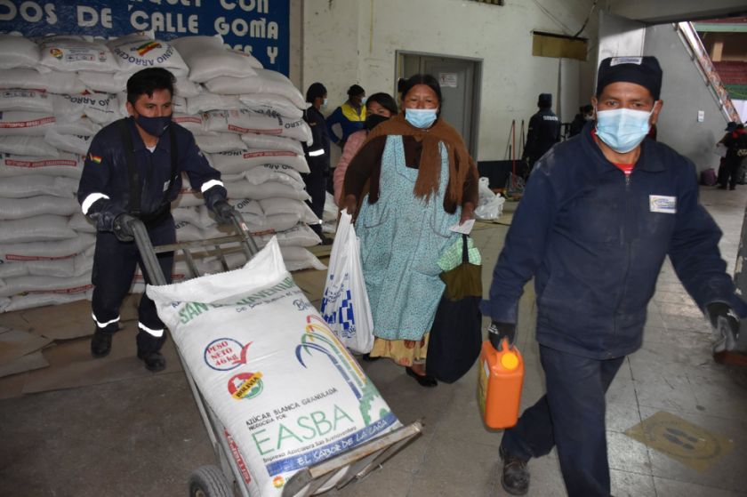 Cada paquete alimentario tiene un valor de Bs 500 y contiene un quintal de azúcar, un quintal de arroz, cuatro litros de aceite y una arroba de harina, entre otros productos nacionales.