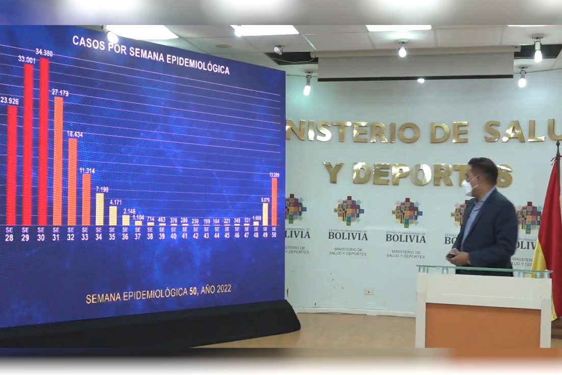 “Esta semana se han reportado 13.289 casos, son 7.210 casos más que la semana pasada, significando esto un incremento a nivel nacional de 119 por ciento respecto a la semana anterior. Esta semana se registran 13 decesos. Es la sexta semana de incremento de casos en el marco de la sexta ola epidemiológica”, señaló el ministro de Salud y Deportes, Jeyson Auza, en la conferencia habitual de los lunes.